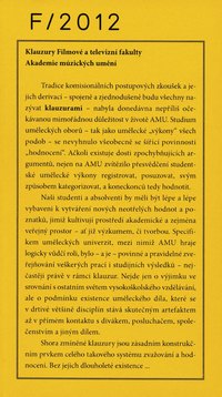 V rámci ročníkových klauzur či státních zkoušek bylo na Filmové a televizní fakultě AMU v roce 2012 prezentováno 144 autorských filmů a audiovizuálních instalací, 20 scénářů a 52 fotografických souborů. Pozvání na klauzurní projekce a prezentace přijalo 13 hostů, kteří je reflektovali ve svých textech pro tuto knihu. Nad dvěma pojetími režie – jako autorského gesta a jako uspořádání jednotlivých výrazových prvků – se ve své eseji zamýšlel kritik Antonín Tesař. Do kontextu režisérských vzorů vložil studentské filmy ředitel distribuční společnosti Artcam Přemysl Martinek. Autorský styl a vztah k žánrům analyzovala teoretička a básnířka Mária Ferenčuhová. Na dramaturgické otázky se zaměřila střihačka Jana Vlčková. Příběh, postavy a způsob filmového vyprávění promýšlel programový ředitel karlovarského festivalu Karel Och. Teoretik Pavel Bednařík vhlédl do rozmanitosti témat ve vztahu k míře a podobě osobního zaangažování režiséra. Filozof Josef Fulka hledal v studentských filmech neotřelost a originalitu. Dramaturgyně Eliška Děcká vsadila animované filmy do zahraničních souvislostí. Marek Hovorka, ředitel festivalu v Jihlavě, se zamýšlel nad společenským přesahem dokumentárních snímků. Dokumentarista Vít Janeček zrekapituloval aktuální tvorbu nejmladší katedry, kterou před deseti lety spoluzakládal. Kurátorka Barbora Šedivá popsala audiovizuální zážitek z galerie. Bohemista Miloslav Caňko nahlížel na autorské počiny studentů katedry střihové skladby. Teoretička Pavlína Vogelová upozornila na práce na hranici filmu a instalací.